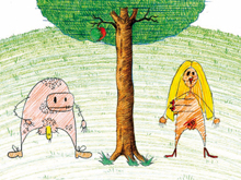 Adam und Eva im Paradies haben ein Problem. Adam quält seit langem der Hunger nach Evas Apfel, den sie in weiser Voraussicht von Adam fernhält. Sein Verlangen dem Apfel steigert sich jedoch ständig und als Adam gelenkt von der Schlange, immer rabiater und aufdringlicher wird, eskaliert die Situation. Nach mehren erfolglosen Versuchen Evas Adam zu entkommen ist der Streit um den Apfel voll entbrannt den keiner von beiden gewinnen kann. Was dann passiert kennt eigentlich jeder. Diese Version der Vertreibung aus dem Paradies, ist die logische Konsequenz.